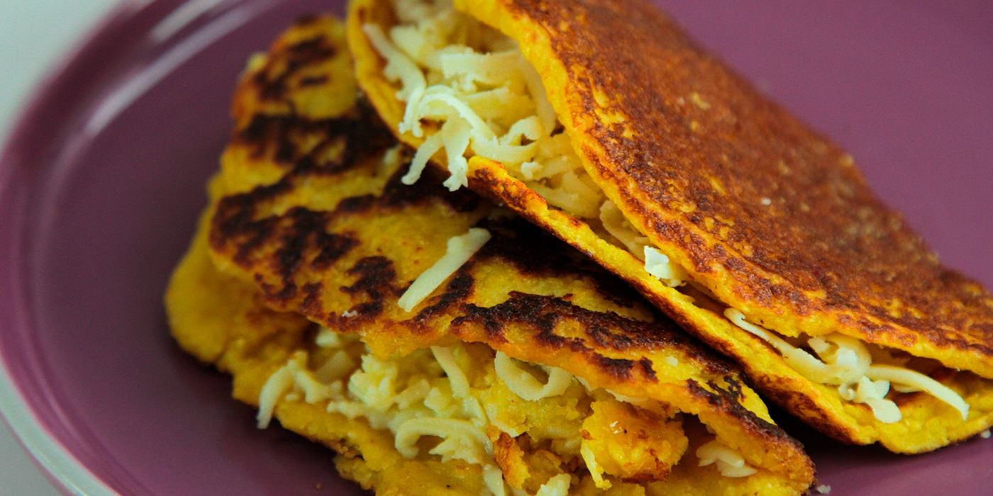 - 3En una sartén a fuego medio pon un poco de mantequilla, añade la mezcla para formar la arepa, tapa por 2 o 3 minutos o hasta que esté seca por arriba. Añádele queso rallado o troceado, dobla a la mitad y tapa medio minuto más para suavizar un poco el queso.