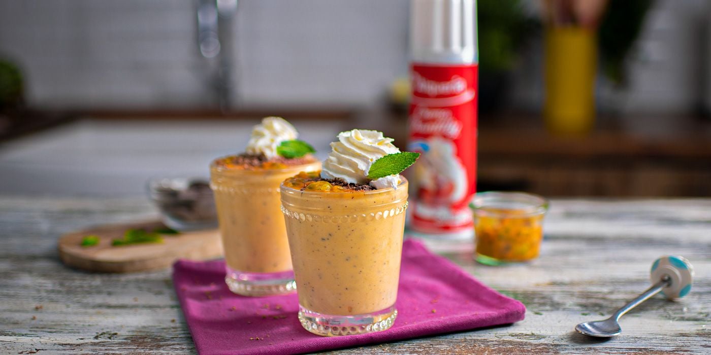 - 6Decorar con los trocitos de maracuyá entera, la chocolatina rallada y la hierbabuena