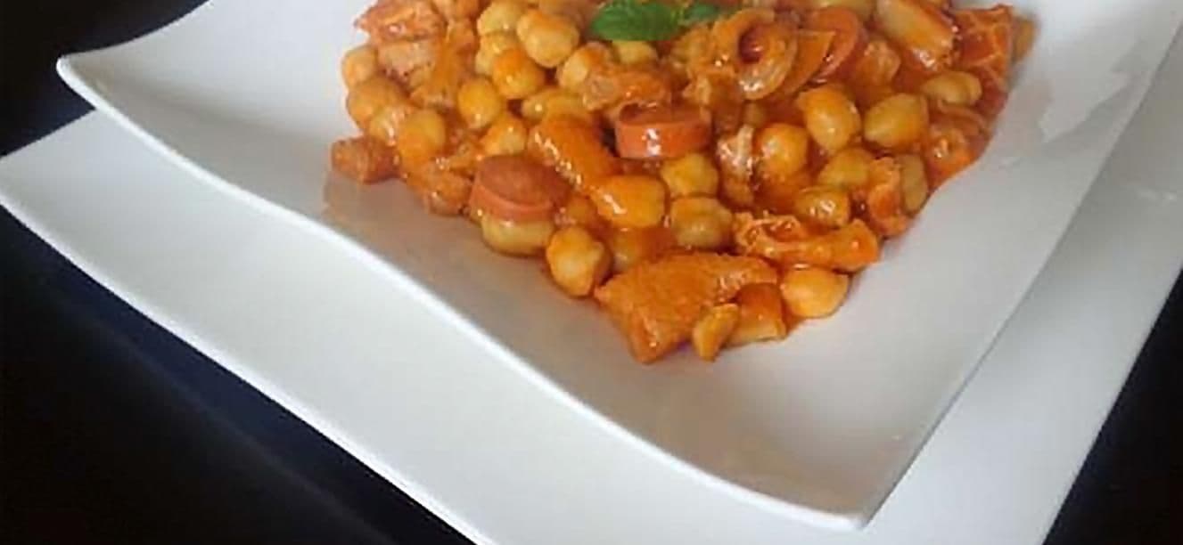 - 2En una sartén calentamos la mantequilla y doramos las salchichas. Luego agregamos los garbanzos, la pasta de tomate, la salsa de tomate y la Crema de Leche Alquería.