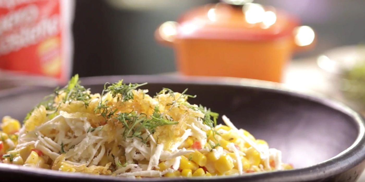 - 5Servimos el maíz caliente en el plato, sobre este ponemos una capa de las papas y terminamos decorando con el cilantro finamente picado.