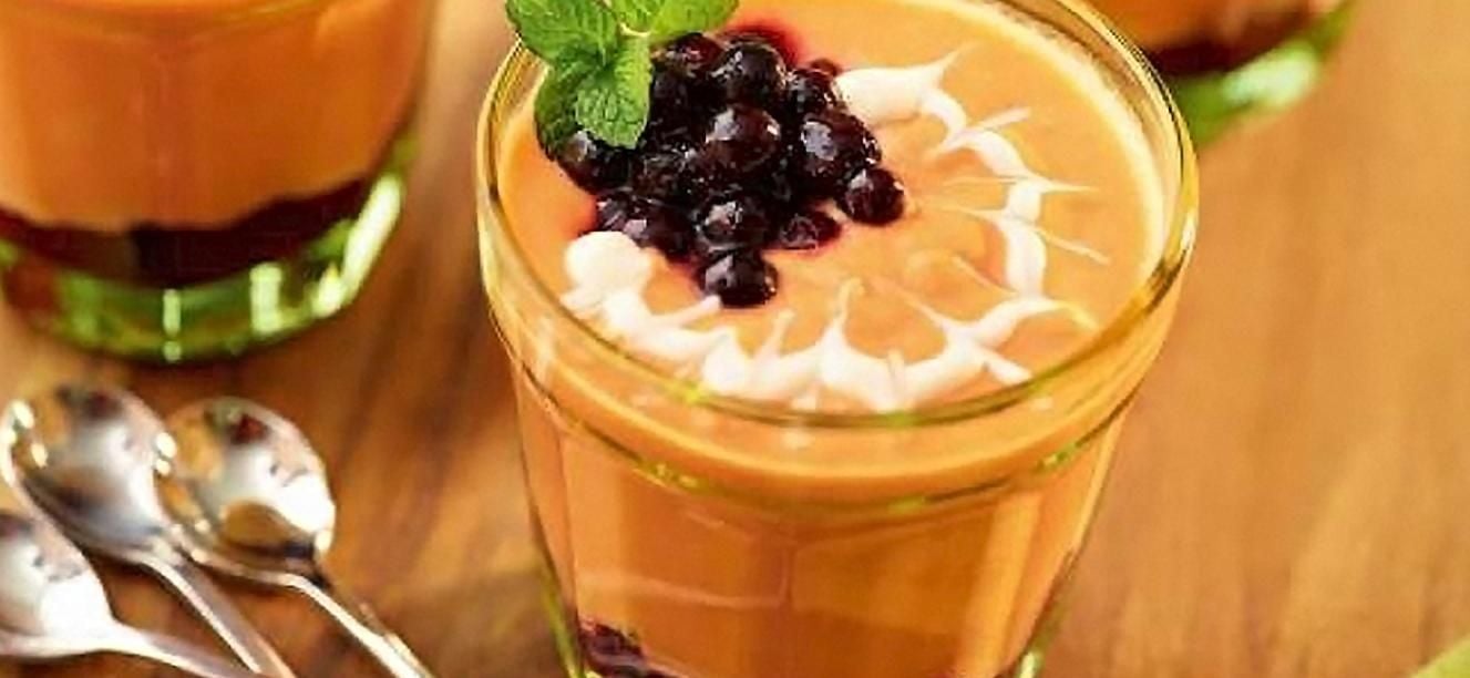 - 3Ponemos una cucharada de la confitura de agraz en la base de un vaso y servimos encima la crema de papaya.