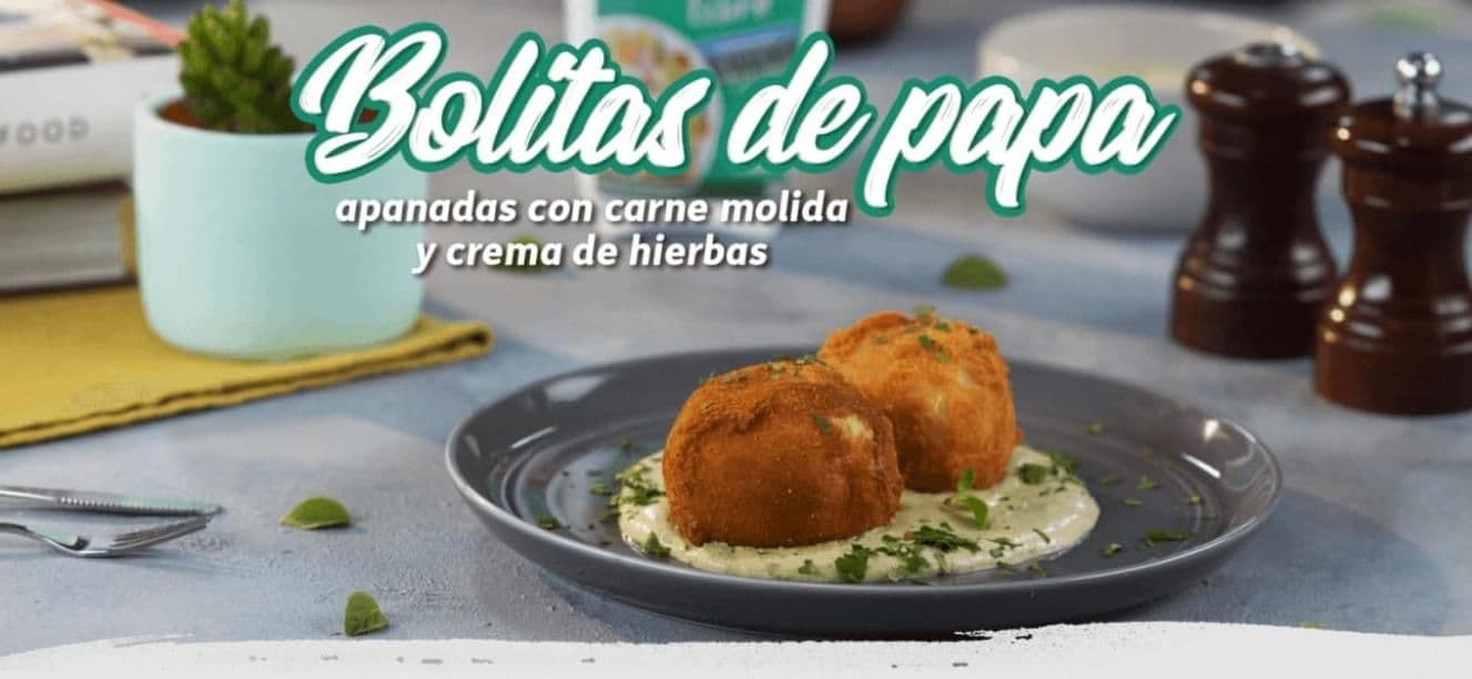 - 9Para el armado: Tomar una porción de puré (aproximadamente unos 80g) y rellenarlo con una bolita de carne. Posteriormente cubrirla con el puré y repetir hasta acabarlo.