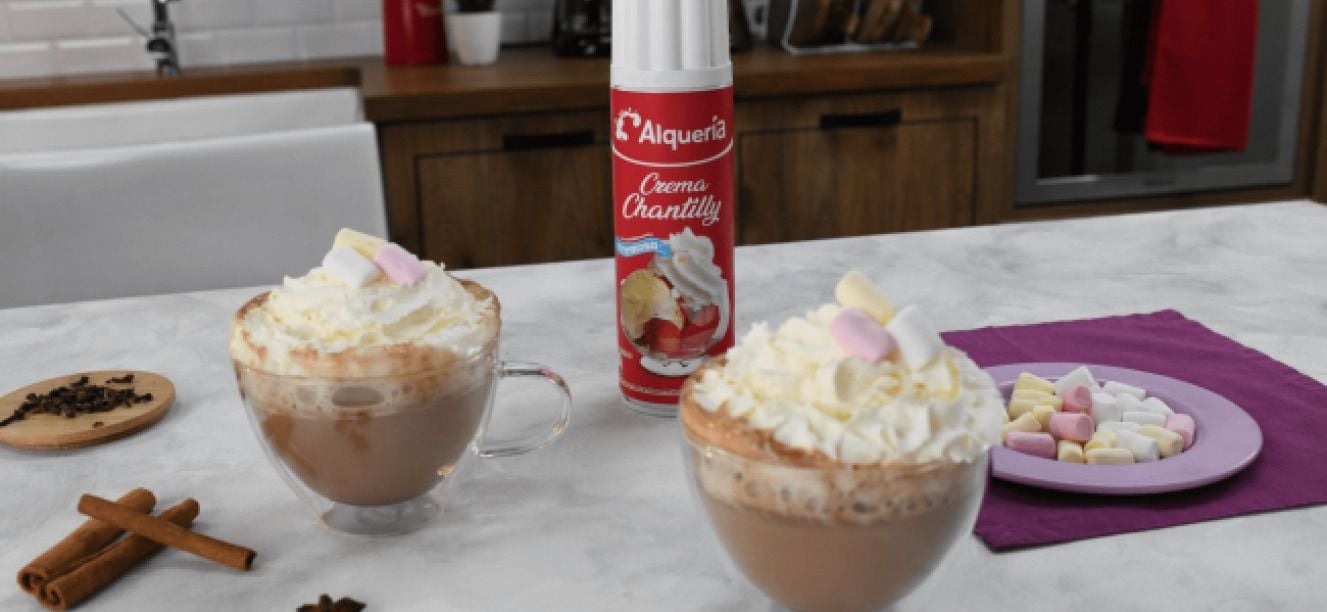 - 5Sobre ésta, servir el chocolate caliente y añadir una capa de mini masmelos y decora con más Crema Chantilly Alquería.