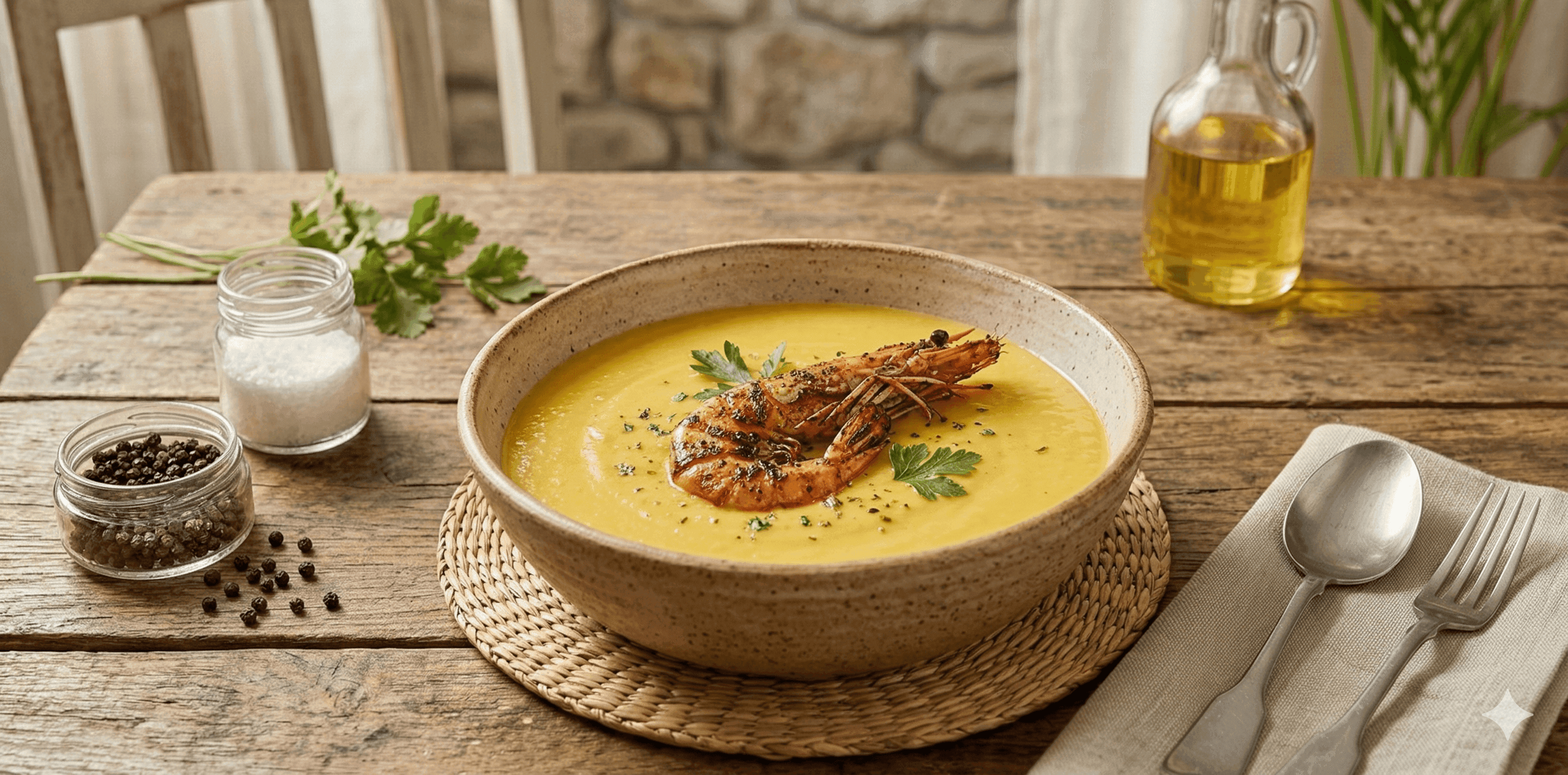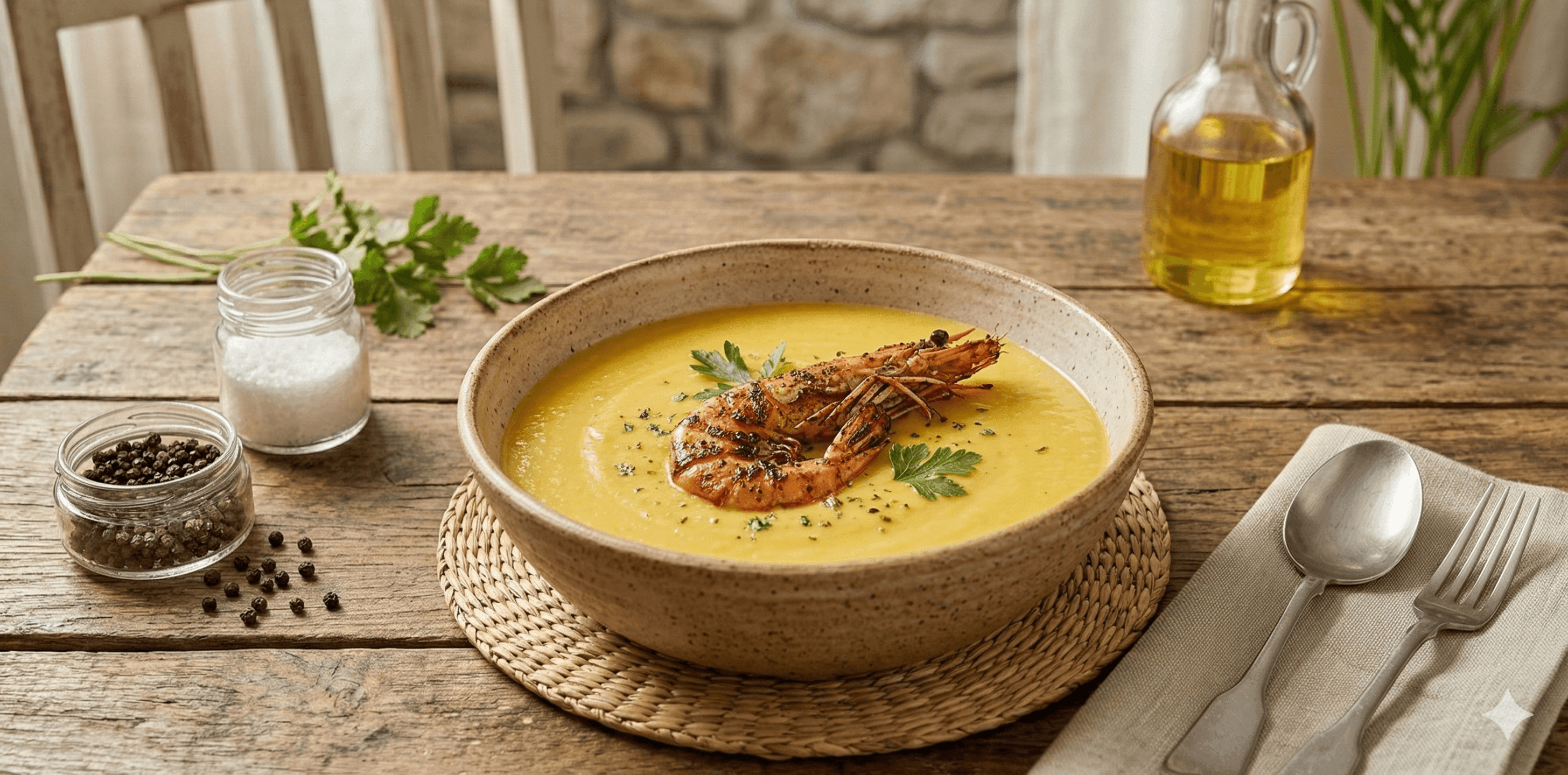 - 5Para servir, ponemos la crema en un plato sopero y en el centro ponemos un langostino; también ponemos un poquito de perejil.