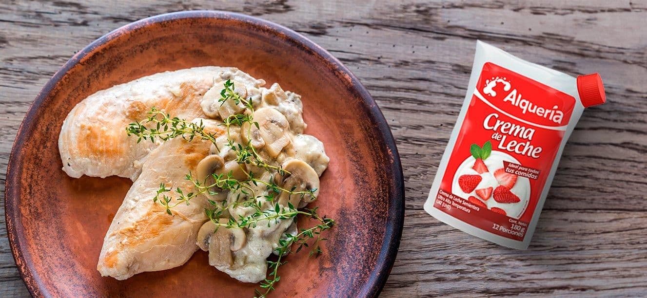 - 10Agregamos el pollo y un chorrito de la Crema De Leche Alquería para que le de la cremosidad ideal y un sabor único, y dejamos cocinar por unos 10 minutos.